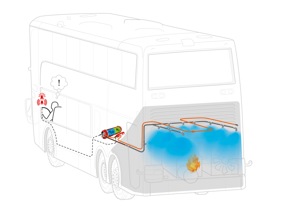 巴士引擎室起火不只會對駕駛或乘客造成毀滅性傷害,也可能導致部分車體或整車毀損。而高壓水噴霧的滅火技術,能有效降低引擎室火災對於生命安全與車體產生的威脅。滅火系統的有效性是保護巴士重要的一環,亦可降低起火後巴士損壞維修成本。投資一個有效率的高壓水噴霧滅火系統,只會占巴士採購總額中的小部分。 世界上,各組織已制定相關安全法規,規定巴士必須在引擎室內安裝自動滅火系統。 並且,已經有保險公司與巴士營運商將滅火系統視為標準配備。目前我們可以看見滅火系統未來趨勢與發展,根據聯合國的新法規UN ECE R107(參閱下方)。至今已有大約50國歐盟國已簽屬法規,且其他歐盟外的國家也有可能會並行,法規R107中敘述由2021年起每輛新出廠的巴士,乘客乘載量超過22員時,就需要在巴士內安裝由OEM廠認證的滅火系統。R107法規將會在2018-2019年間落實,逐步地在各遊覽車上被推行,且最終在2020-2021年間開始規範通勤巴士。